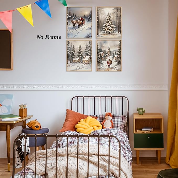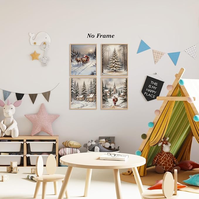 Boat Wades Farmhouse Winter Christmas Wall Art Prints Set of 4, Retro Xmas Santa Sleigh Snowy Forest Posters Pictures Wall Decor for Bedroom Living Room Office, Christmas Home Decor, 8x10 Unframed