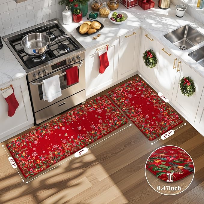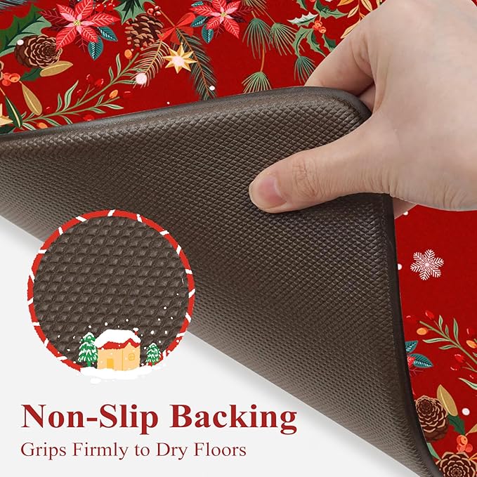 Christmas Kitchen Rugs Anti Fatigue - Christmas Kitchen Mat Sets of 2, Cushioned Non-Skid Waterproof Vintage Floral Christmas Decorations Gift for Holiday Floor Decor Home Laundry Sink(Red)
