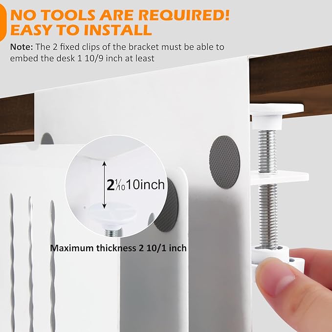 - Multifunctional desk side storage -The hanging desk organizer can be fixed in thickness from 1 cm to 5.8 cm and can be adapted to the side of a table to easily place laptops, tablets, hidden wires, internal accessories, manuals, documents, notebooks, and other items. The under-desk laptop holder has a heat sink so that when you charge your laptop or tablet, you don't have to worry about heat not being discharged