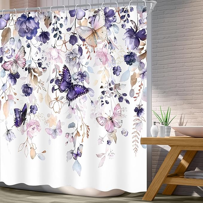 Purple Floral Butterfly Shower Curtain 72Wx72L Inch Summer Spring Plant Natural Gold Leaves Botanical Bathroom Set Girl Woman Elegant Country Bath Curtain Bathtub Accessories Home Decor