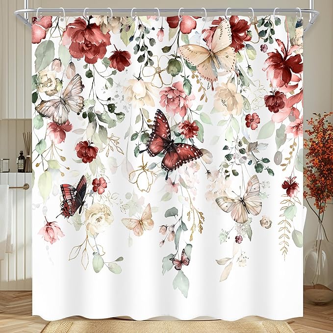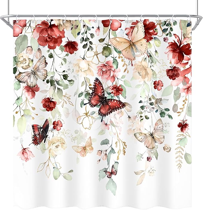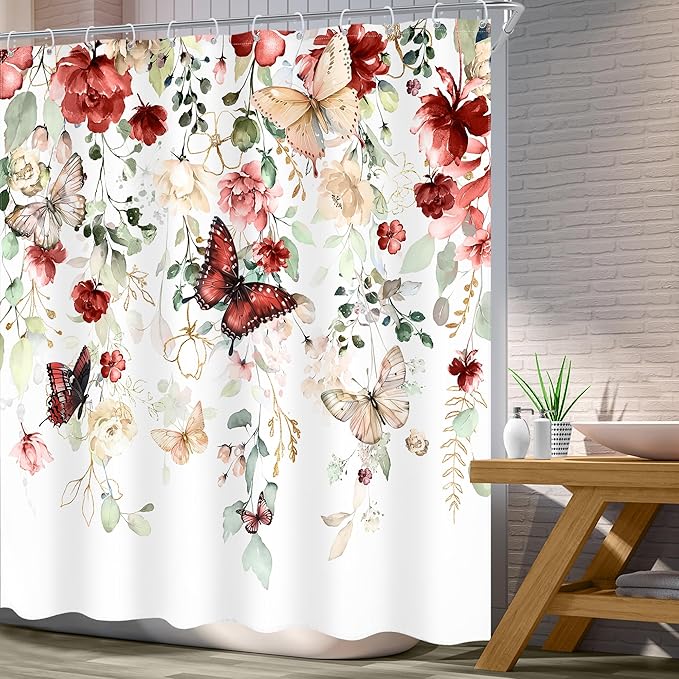 Red Floral Butterfly Shower Curtain 72Wx72L Inch Summer Spring Plant Natural Gold Green Leaves Botanical Bathroom Set Woman Girl Elegant Country Bath Curtain Bathtub Accessories Home Decor