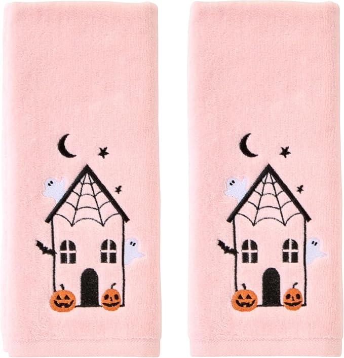 SKL Home Halloween Haunted House 100% Cotton Embroidered 2pc Hand Towel Set, Decorative for Bath/Kitchen/Bar & Gift, Pink