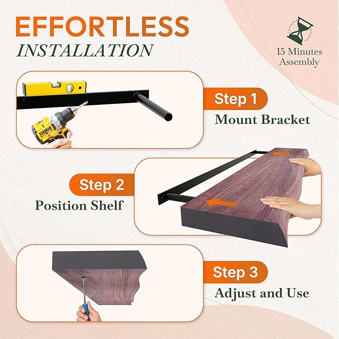 - EASY TO INSTALL: All necessary hardware is included, and each package comes with simple instructions, allowing you to complete the installation in just 15 minutes. Specially, this floating shelf can be easily arranged in various layouts, allowing you to creatively decorate your home in your own style.