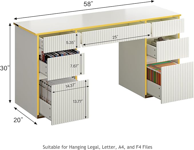 58 Inch White Desk with Drawers, Home Office Desk with 7 Drawers, Fluted Computer Desk with File Drawers for Study, White and Gold Executive Desk for Living Room, Bedroom