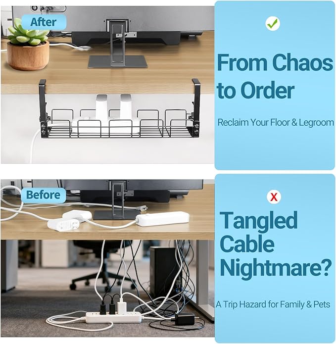 - 🔧No Drill, No Damage Installation: Our under desk cable management tray uses a clamp-on design with protective rubber pads, so you can easily attach it to wood, glass, metal, or marble desks without screws or drilling. Quick to install, secure, and leaves no marks.