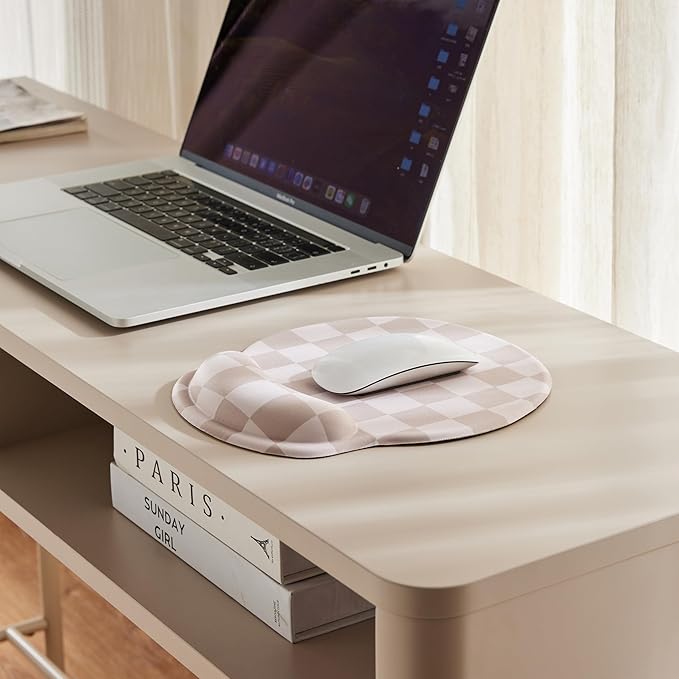 Beige Khaki Checkered Mouse Pad with Gel Wrist Rest, Wrist Support, Ergonomic Desk Accessories for Women, Office Laptop Gaming Decor, Cute Aesthetic Check Design