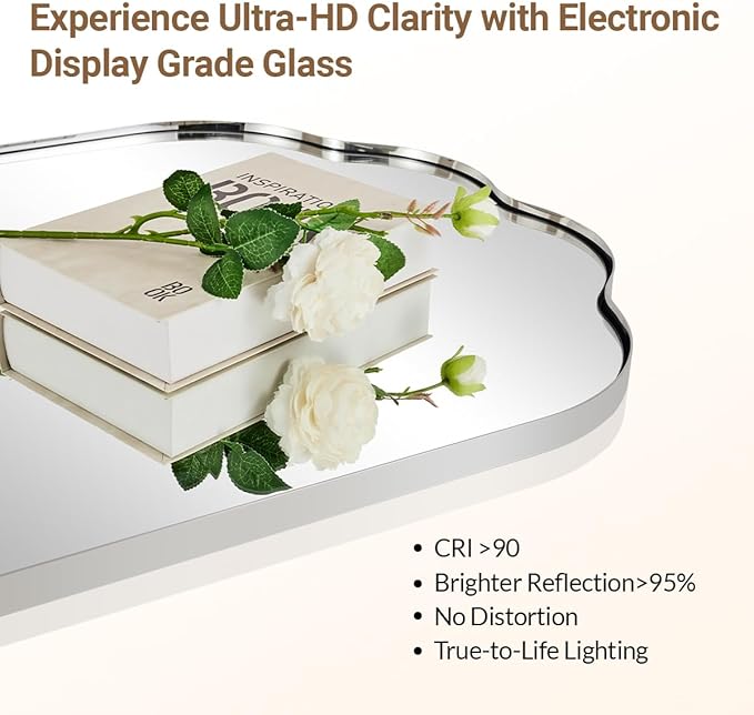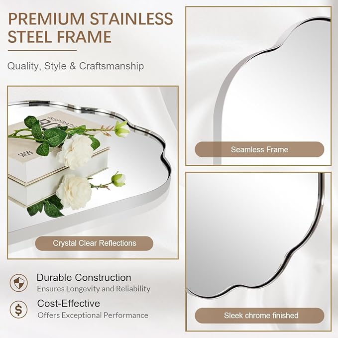 - Premium Stainless Steel Frame: Crafted from SUS304 stainless steel with a modern polished chrome finish, this frame resists oxidation—ideal for humid spaces like bathrooms. The sturdy 24x36-inch scalloped bathroom mirror, weighing 19.1 lbs, is designed to maintain its luster and stability for years