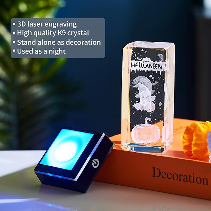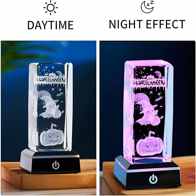- π Halloween 3D Crystal Night Light β Pumpkin, Ghost & Skull Design Exquisitely crafted from 3D K9 crystal, featuring Halloween-themed pumpkin, ghost, and skull elements. Paired with a colorful LED base, it creates a mysterious yet cozy festive atmosphere, making it a standout decoration for Halloween parties and Trick or Treat celebrations.