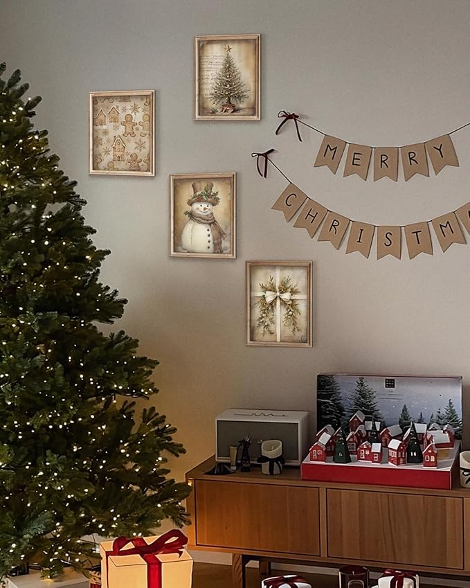 Wheatwin Vintage Christmas Wall Decor, Christmas Tree Snowman Wall Art Prints Set of 4, Boho Wall Decor for Bathroom Home Bedroom Living Room Office, 8x10 (Unframed)