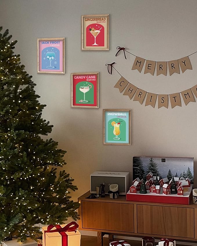 Wheatwin Retro Cocktail Christmas Wall Art Prints Set of 4, Funny Gingerbread Alcoho Wine Glass Print Cute Preppy Posters Aesthetic, Dorm Bar Party Kitchen Decor, 12x16 (Unframed)