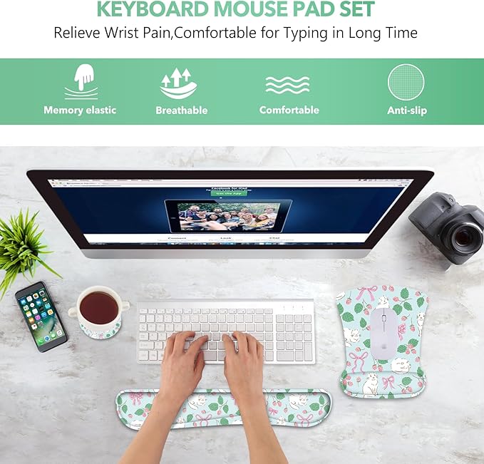 - Excellent Quality. The surfaces of keyboard and mouse pad set is made of smooth, breathable fabric, supple comfortable touch. Edges has been reinforced to prevent deformation and damage to guarantee the long time use. The fill material of wrist support adapts premium-quality memory foam that can slow bounce back to its original shape after your hands leaves it, not easy to out of shape.