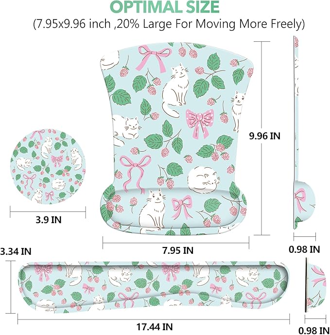- Optimal Size. Wrist mouse pad (7.95inch x 9.96 inch), keyboard wrist rest support pad (3.34 inch x 17.44 inch), Excellent texture. Designed with an optimal shape and size. Suitable for both man/women. The reinforced edges prevent deformation and damage to long time use. Fit for all kinds of mouse / keyboard.