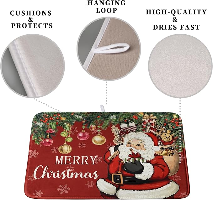 - Ultra Absorbency: The surface of the Christmas theme drying mat is made of absorbent microfiber and the middle is made of composite sponge, absorbs 4X its weight in water, keep your counter dry. Absorbent, Colorful, Reversible, do not fade