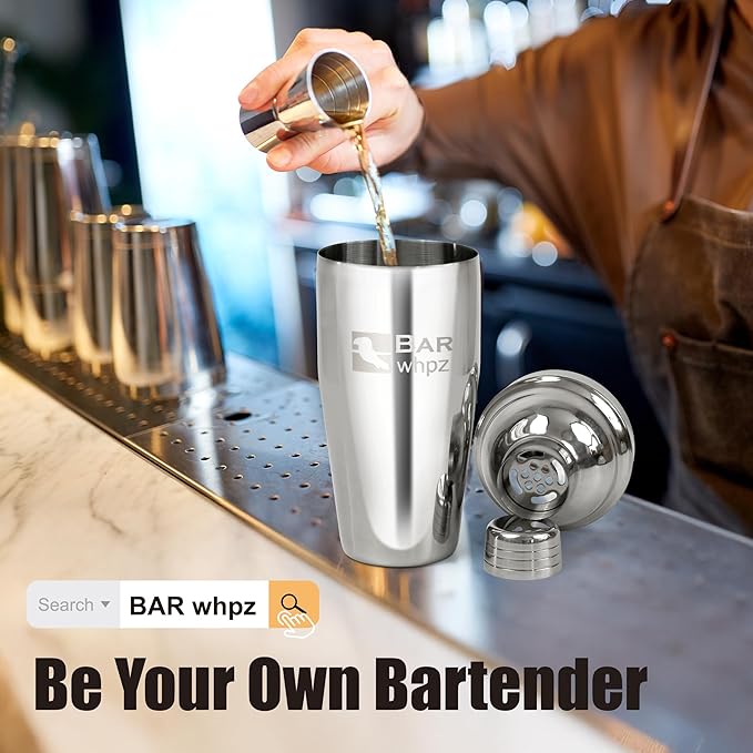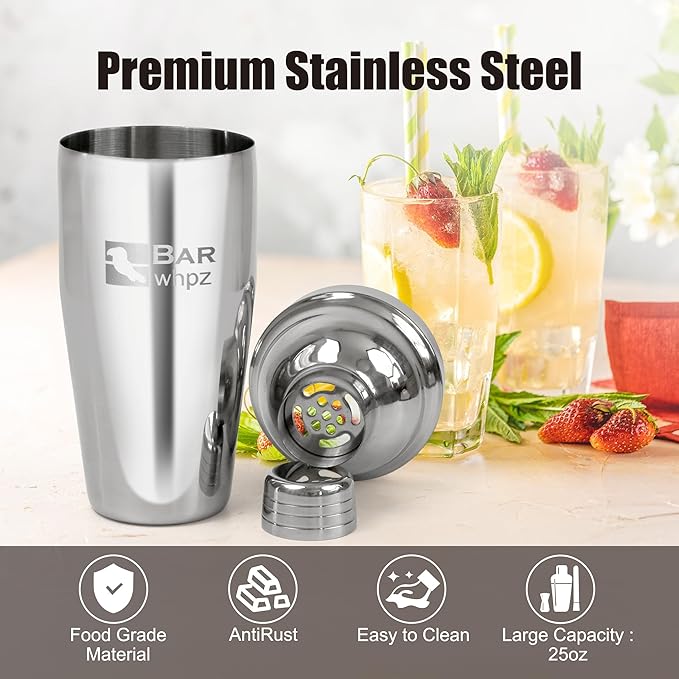 - [Premium Stainless Steel Durable&Safe] This cocktail shaker set is crafted from high-quality stainless steel, ensures excellent texture and performance during long-term use. The material is safe,allowing you to prepare every cocktail with confidence. It meets the needs of both daily home use and professional bar operations.