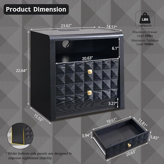 - STABILITY AND DURABILITY: Made from high-quality medium-density fiberboard (MDF) and P2-grade engineered wood. The base features a widened side panel design to enhance the stability of the nightstand. The tabletop can support up to 130 pounds, and the drawers can support up to 20 pounds. High-quality coating ensures that the nightstand is easy to clean and wear-resistant, extending its service life