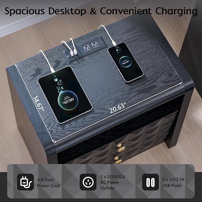 - CONVENIENT FUNCTION: The modern nightstand has a built-in charging station. It comes with 2 USB ports and 2 AC outlets to ensure that your devices are always fully charged and ready to go. A 1.97-inch diameter cable management hole on the back panel keeps your space neat and organized. Spacious desktop provides plenty of room for your essentials and favorite decorations