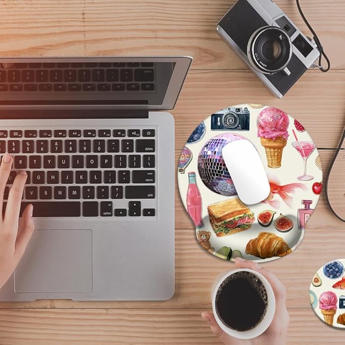 - Functional Coaster and Coordinated Aesthetics: Keep drinks secure and desks pristine with our 3.9" non-slip coaster, designed to catch every coffee spill and condensation ring. Paired with the cute mouse pad with wrist rest, they share identical artistic designs—modern marble, kawaii florals, or retro pixels—to transform your workspace into a clutter-free stylish sanctuary.