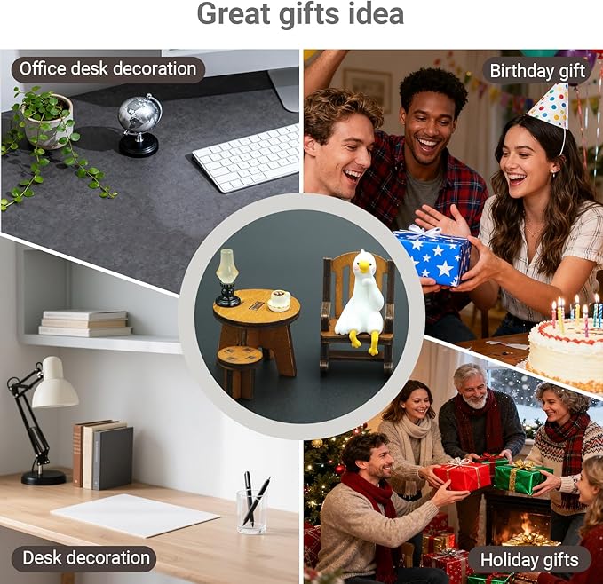 - Perfect Gifts: The charming miniature figurines decor make a perfect cute gift for white goose, duck, pomelo or animal lovers The tiny wooden table, stool & rocking chair sets are perfect for dollhouses, creative dioramas, desktop displays, or as a unique decorative accent. they are nice gifts for friends, family,colleagues for Christmas, anniversary, birthday etc.