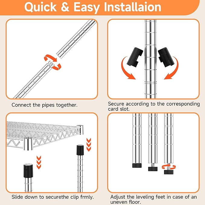 - HEAVY DUTY STORAGE SHELF: Our storage shelf is made of study high-quality carbon steel and metal rods and each shelving unit holds up to 350LBs on leveling feet, with a total bearing capacity of 2100LBs