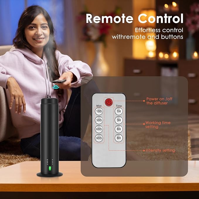 - 【Multiple Modes, Easy to Use 】: 3 intermittent spray settings and 4 timer settings. Easy operation via the button or remote control allows for customized aromatherapy, bringing ultimate convenience to your daily life. If the device is accidentally inverted or tilted, the automatic overflow prevention function temporarily shuts off to prevent oil leaks.