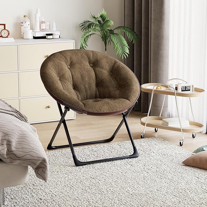 Folding Faux Fur Saucer Chair,Portable Folding Soft Moon Chair,Comfortable Lounge Chair with Metal Frame for Bedroom, Dorm Rooms, Apartments, Lounging, Garden and Courtyard, Brown