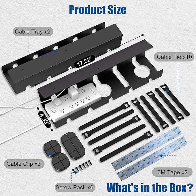 - All Accessories Included:This wire management under desk comes with 2 metal trays, 10 reusable cable ties, and 3 versatile mounting clips. Use them to route, group, and secure cords neatly.