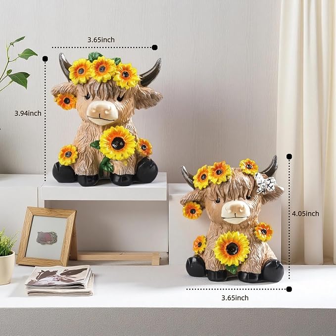 - Highland Cow Statue Set of 2 beautifully crafted brown Sunflower Highland Cow Ornament Adds natural, rustic warmth indoors or outdoors, with timeless design for lasting beauty.