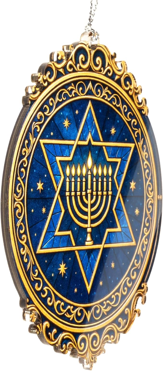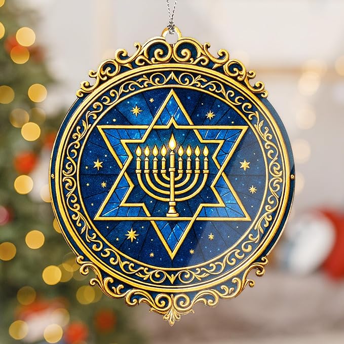 Hanukkah Ornament – Jewish Star Menorah Decoration | Judaica Gifts - Festival of Lights - Holiday Window Decor - Jewish Home Decor – Suncatcher Stained Glass Effect - Car Hanging Mirror
