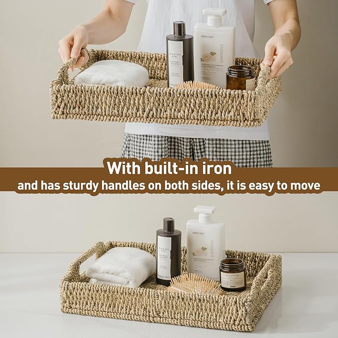- 【Multi functional Seagrass Tray】: The wicker tray measures 16.9" L x 12.9" W x 1.96" H, providing ample storage space and elegant proportions. It can be used as a breakfast tray, living room storage, bedroom storage, bathroom storage, and any other desired location.
