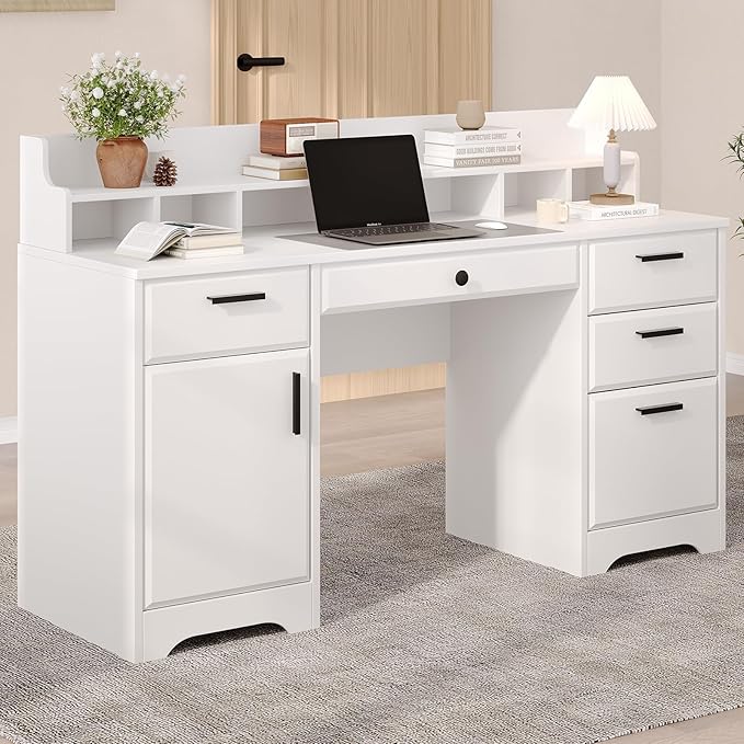 Executive Desk with Hutch, 58 Inch White Computer Desk with 5 Drawers, Home Office Desk with Storage, Rustic Desk with Adjustable Shelves and Storage Cabinet for Bedroom