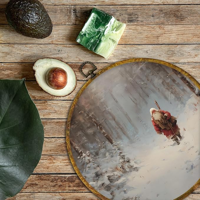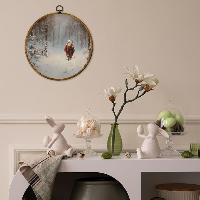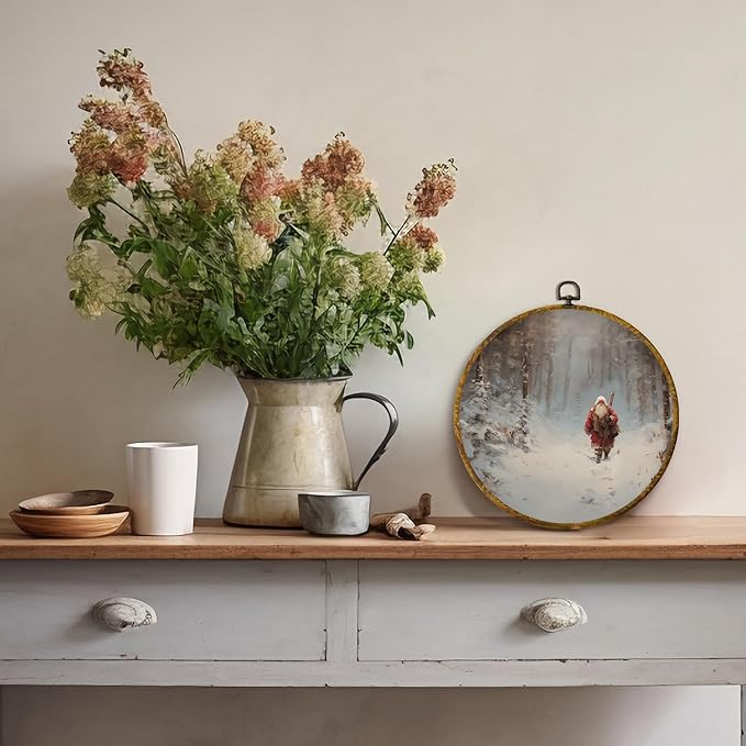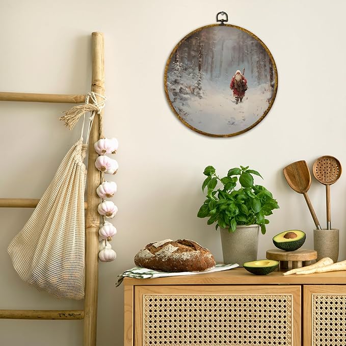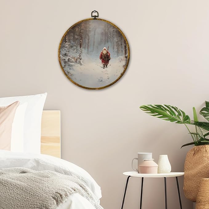 QZQE Vintage Winter Christmas Santa Round Wall Art Decor Framed, Winter Christmas Circle Canvas Prints, Rustic Forest Xmas Santa Circular Wall Hanging Decor for Home Bedroom Living Room, 10x10 Inch