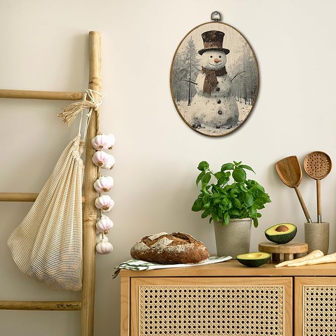 QZQE Vintage Christmas Snowman Oval Wall Art Decor Framed, Winter Christmas Oval Canvas Prints, Rustic Farmhouse Winter Xmas Snowman Wall Hanging Decor for Home Bedroom Living Room, 8.6x11.4 Inch