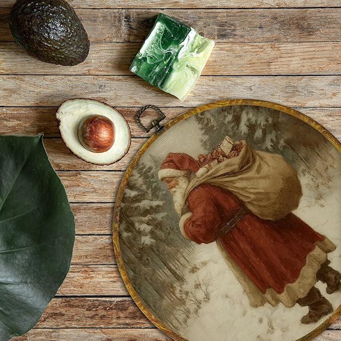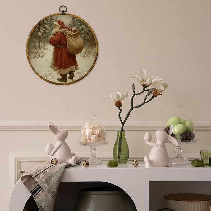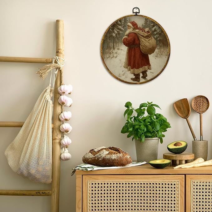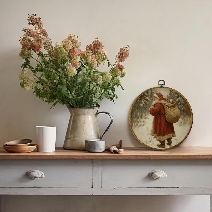 QZQE Vintage Santa Christmas Round Wall Art Decor Framed, Retro Christmas Circle Canvas Prints, Rustic Winter Snowy Xmas Santa Circular Wall Hanging Decor for Home Bedroom Living Room, 10x10 Inch