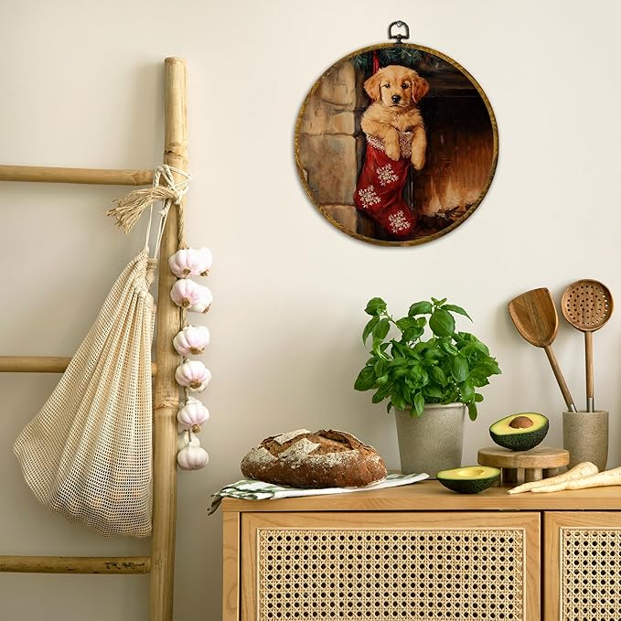 QZQE Vintage Christmas Golden Retriever Round Wall Art Decor Framed, Christmas Dog Circle Canvas Prints, Moody Winter Xmas Dog Stocking Circular Wall Hanging Decor for Home Bedroom, 10x10 Inch