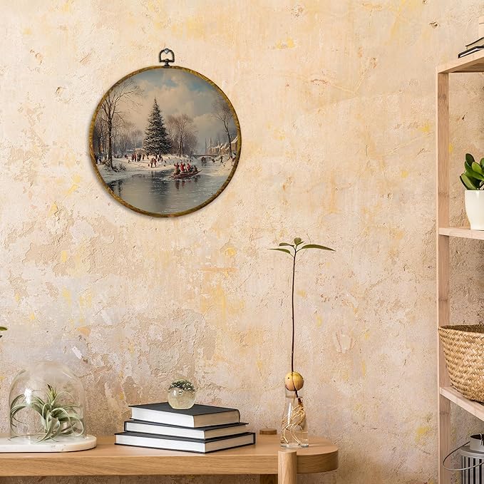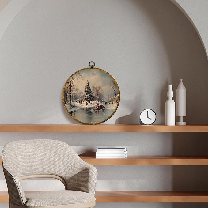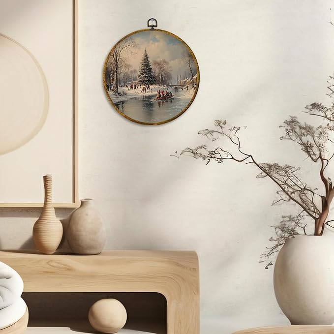 CUANFDDSF Rustic Christmas Winter Round Wall Art, Christmas Winter Scene Framed Hanging Wall Decor, Farmhouse Cozy Xmas Holiday Canvas Prints Decorations for Home Bedroom Living Room, 10x10 Inch