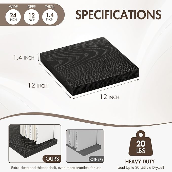 - [GENEROUS DISPLAY & STORAGE] With an expansive 12-inch depth, these floating shelves offer abundant room for books, kitchen essentials, decorative accents, and more. The extra-wide surface accommodates larger items like potted plants, baskets, or framed art, while the 1.4-inch thick design ensures sturdy support. Perfect for organizing and showcasing your favorite pieces without compromising on style or functionality.