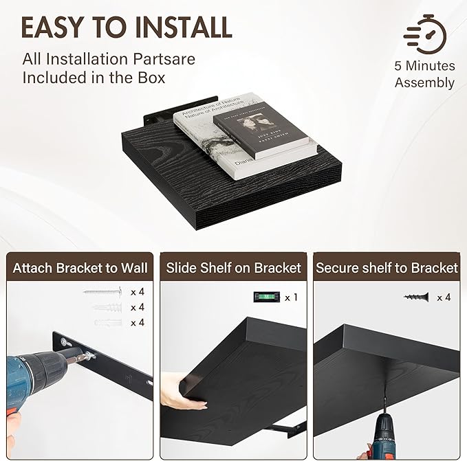 - [EFFORTLESS INSTALLATION] Each set comes with all necessary hardware and a clear, step-by-step guide for quick mounting. Transform your walls in minutes—no special tools required. Whether you're a DIY beginner or a seasoned decorator, these shelves make upgrading your space simple and hassle-free.