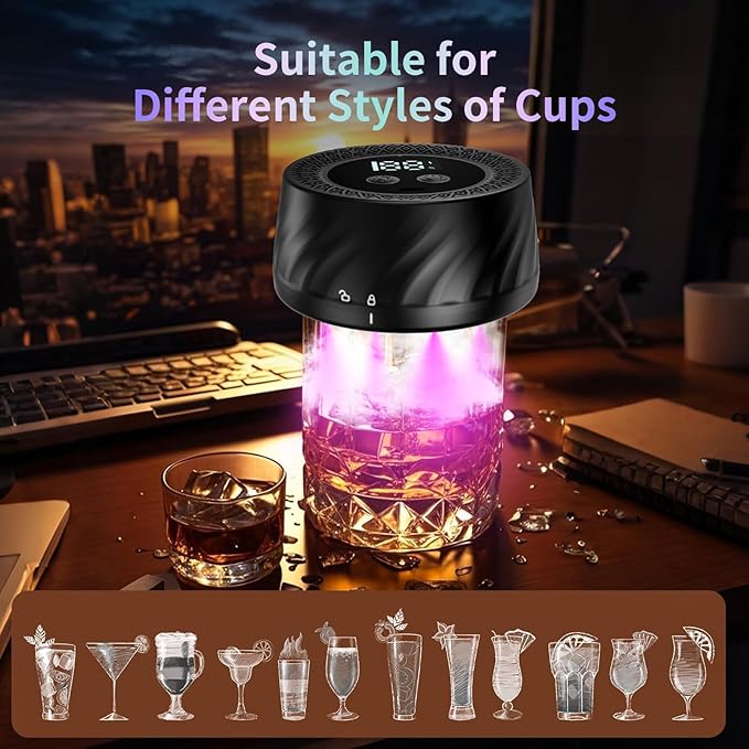 - Innovative Electric Design: This electric whiskey smoker kit features a flame-free design, offering a safer, cleaner, and more efficient way to enhance your drinks and food. The smoker kit also includes built-in LED lighting with six vibrant colors and two lighting modes, adding a visually stunning touch to your drinking experience. Simply recharge via USB, perfect for those who value convenience and sustainability