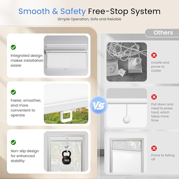 - 【Cordless safety, Free-stop design】Zebra shades adopts the latest safety and labor-saving design. You only need to gently push and pull the blinds to achieve free control. The operation is smooth, safe, worry-free and labor-saving. It is very suitable for families with children, the elderly and pets.