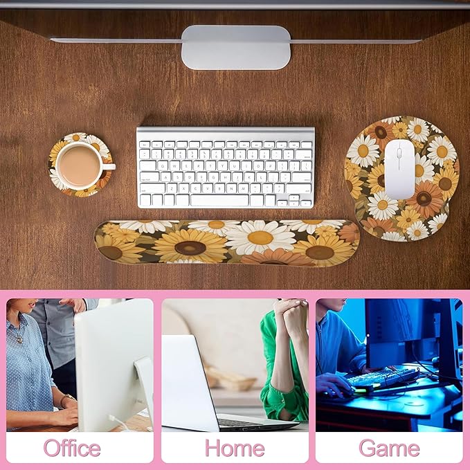 - Ergonomic Design: This Vintage Daisy Sunflower mouse pad set features an ergonomic design that conforms to the wrist, providing a comfortable feel and effective support to help prevent repetitive strain injuries. Its angled design keeps the wrist in a neutral position, avoiding excessive bending. This allows the wrist to maintain a natural and comfortable posture.