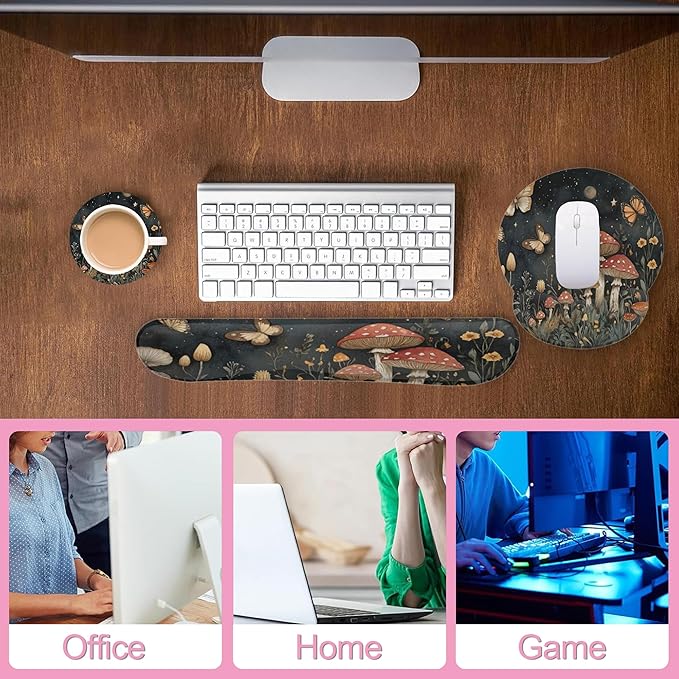 - Ergonomic Design: This Mushroom Flower Butterfly Magic mouse pad set features an ergonomic design that conforms to the wrist, providing a comfortable feel and effective support to help prevent repetitive strain injuries. Its angled design keeps the wrist in a neutral position, avoiding excessive bending. This allows the wrist to maintain a natural and comfortable posture.