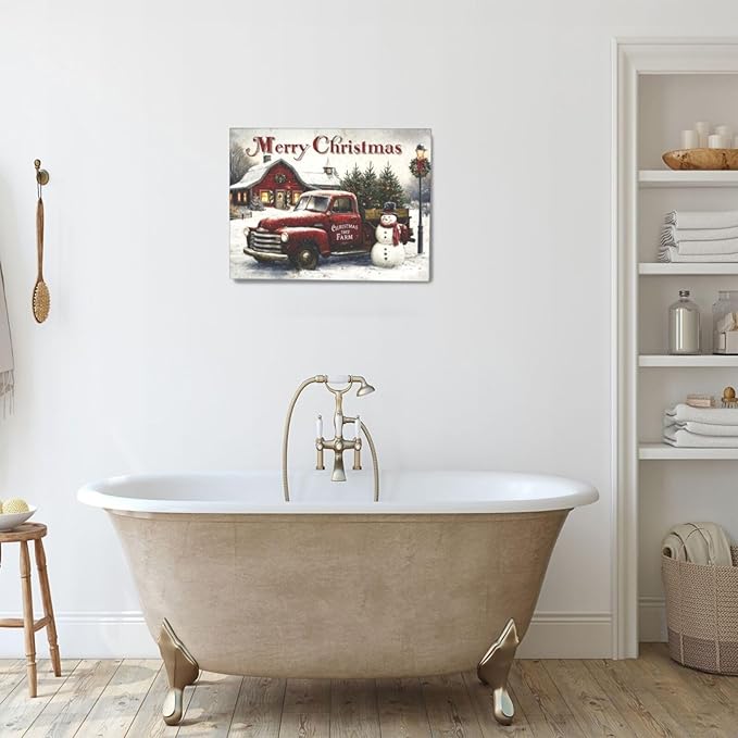 Christmas Pick-Up Truck Wall Art Christmas Tree Canvas Wall Decor Farm Barn Pictures Paintings Prints Snowman Artwork Framed Winter Holidays Decorations For Bathroom Bedroom Living Room Office Gifts 16" x 12"