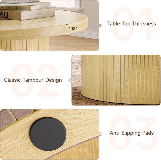 ONBRILL 31.5" Round Coffee Table, Tambour Design Coffee Tables for Living Room, Mid Century Modern Wood Coffee Table, Drum Accent Small Center Table, Oak