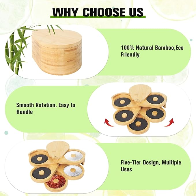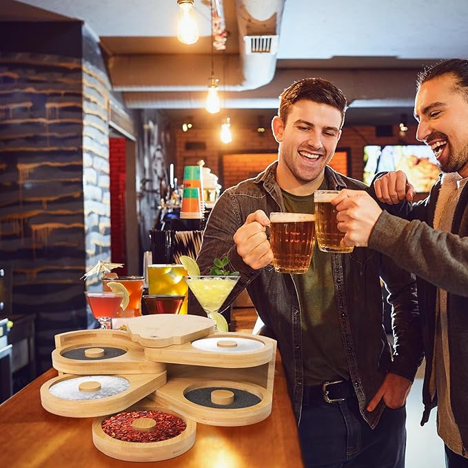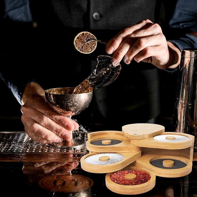 - 【5-Tier Bamboo Design】 Crafted from eco-friendly bamboo, this 5-tier margarita salt rimmer set keeps all your cocktail essentials neatly organized. Each swivel lid opens smoothly for quick access—perfect for salt, sugar, tajin, or chili powder when rimming glasses.