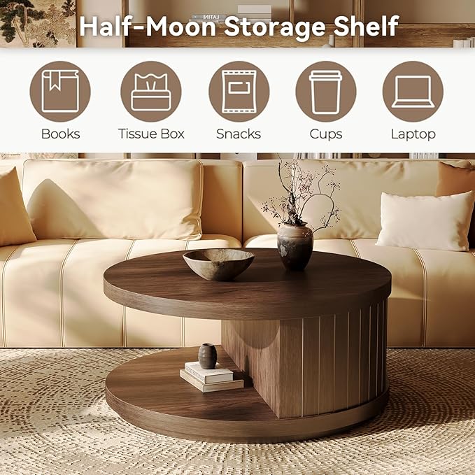 - 31-inch round wood coffee table with spacious 2-tier fluted shelf, perfect for storing remotes, books, and decor, maximizing your living room organization.