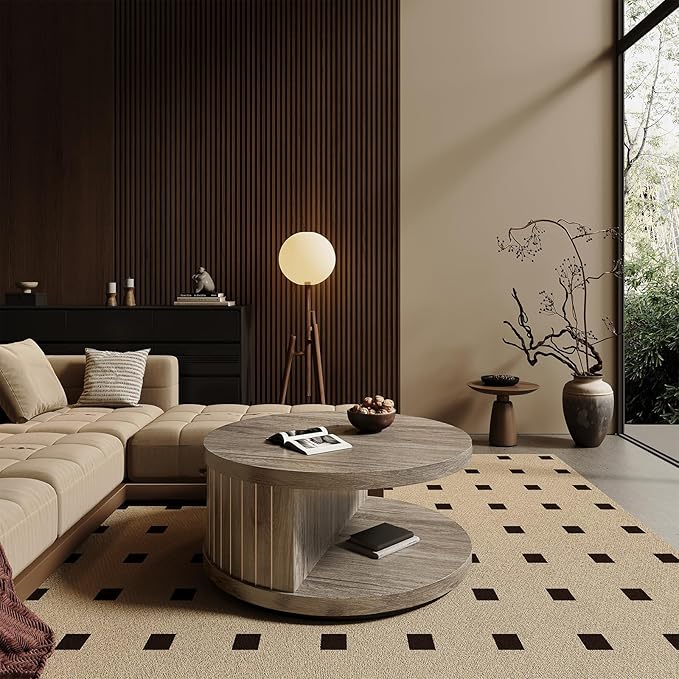 31-Inch Round Wood Coffee Table with Shelf for Living Room, 2-Tier Fluted Center Tea Tables with Wooden Circle Tabletop and Open Shelves for Home Apartment Small Spaces, Wash Gray