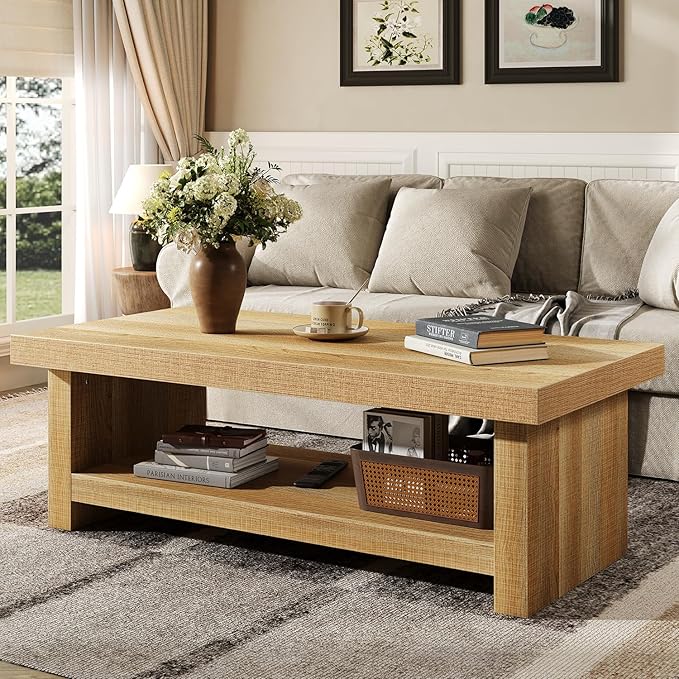 47-Inch Rectangle Coffee Table, Wood Rectangular Center Tables, Farmhouse Low Cocktail Tea Table for Living Room, Thick Base/Easy Assembly, Natural