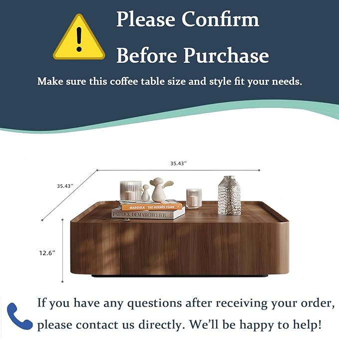 Luxury Solid Wood Coffee Table with Hidden Drawer, Fully Assembled Square Center Table for Living Room, Raised Edge Design, No Installation Needed, Premium Walnut Finish (35.43" Square Coffee Table)