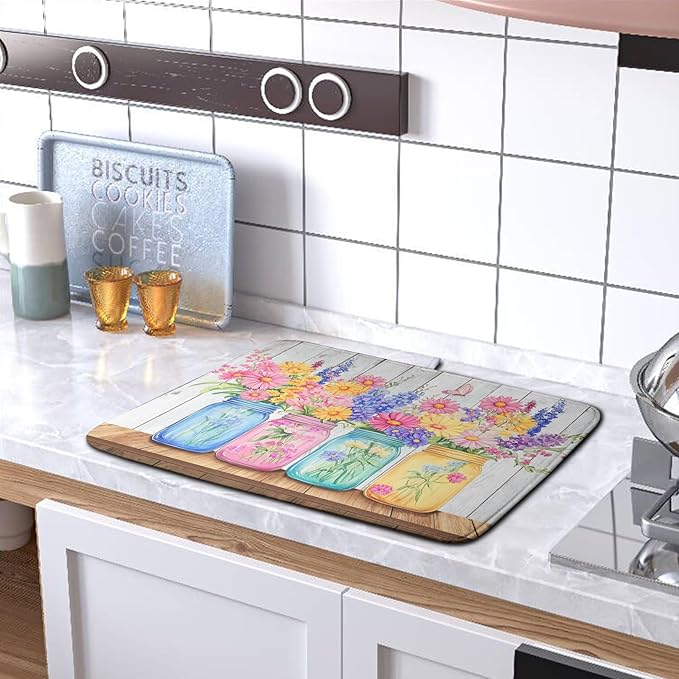 - Multifunctional Pad: Beautiful print on surface side, and reverses to a solid color. The floral mason jar kitchen drying mats absorbs water well, great for air drying dishes, glasses, bottles, silverware, fruits and vegetables, adds stability when drying fragile items