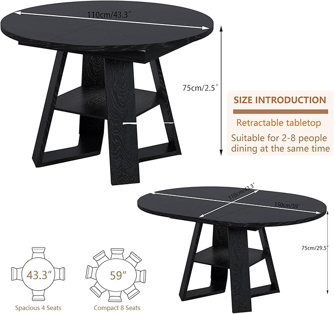 - Retractable dining table for 4-8 people: Considering the use in different scenarios, the dining table adopts a retractable design and a smooth and silent rail. By assembling independent extension leaves in the middle of the dining table, it can be quickly and easily expanded from the original 43.3” round dining table to a 59” L x 43.3” W oval dining table. The extension leaves can be stored under the tabletop, making your space more flexible